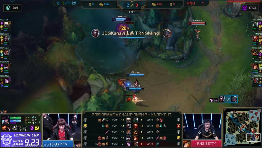 双方都是前期需要打野来带节奏的,但都在没找到好的机会,直到7分钟,RNG下路来到中路游走,帮助小虎拿下牙膏的一血,中路解放后又配合打野击杀了Zoom两次缓解了狼性的压力。JDG也有自己的应对措施,在下半区连控两条小龙并拿下了下路一血塔,这样双方经济差距也不是很大。