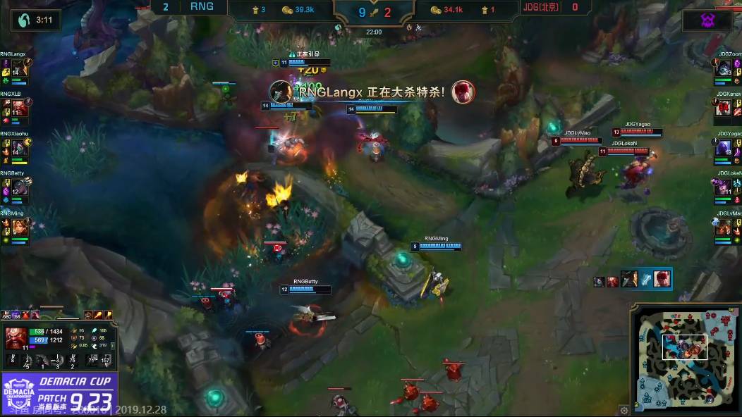 19分半RNG和JDG争夺第三条下龙,双方团战一触即发,小虎阿卡丽找到机会进场切入后排将JDG后排击杀,RNG团战2换5收下小龙。22分钟,小龙堡开团留下瞎子将其击杀,随后大龙逼团,小虎绕后进场,配合塞纳的大招直接融化JDG后排,小虎三杀收尾,再次团灭JDG。此时JDG外一塔全掉,RNG开始压制JDG视野,在大龙处做文章。