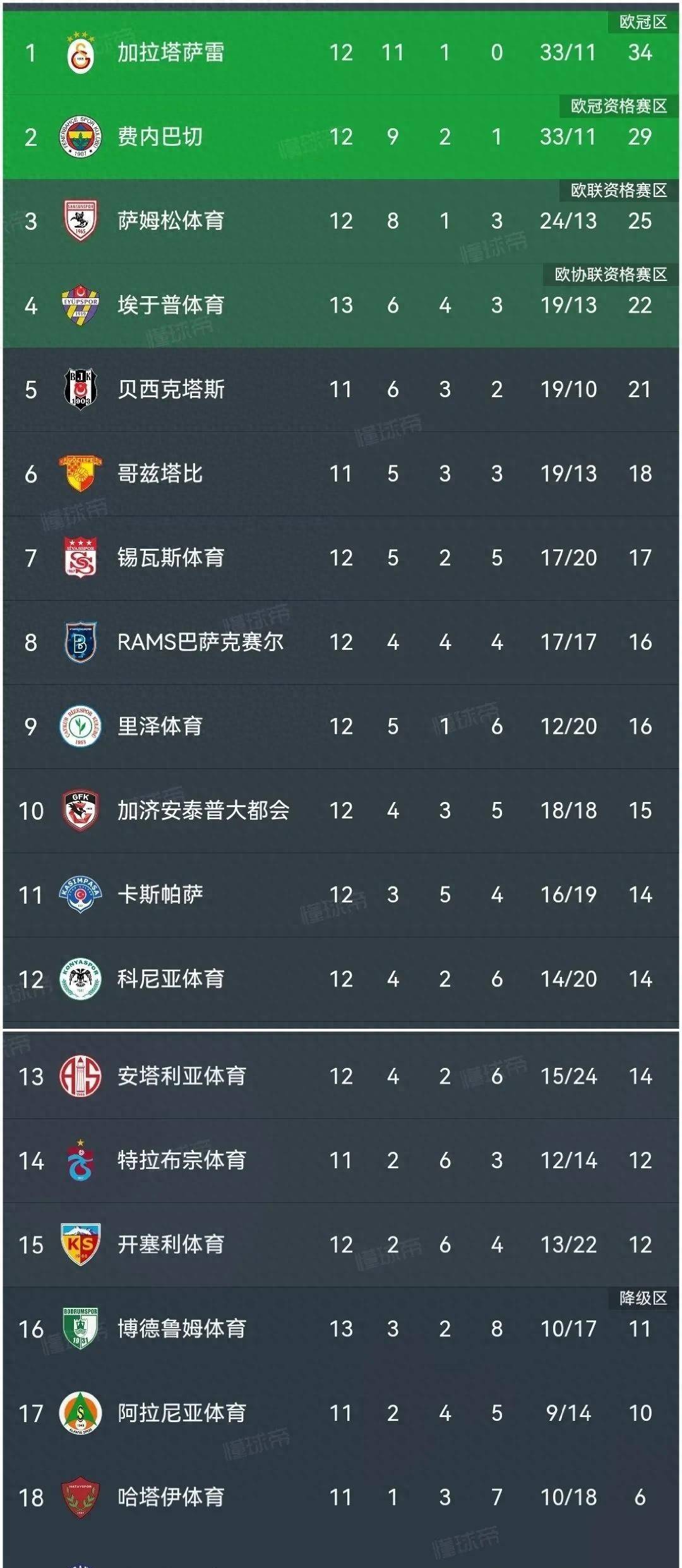 - 土超积分榜费内巴切62大胜坐稳第2加拉塔
