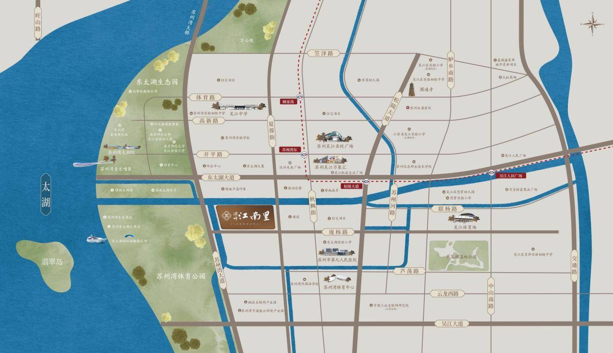 周边万象汇、吾悦广场等大商场环绕,文化中心、体育中心、奥莱店都在生活圈里,商业配套十分成熟。更难得的是,西边就是东太湖百里风光带和生态园,真正实现了把城市的繁华和自然的宁静都收入囊中,是理想的苏州湾宜居楼盘。