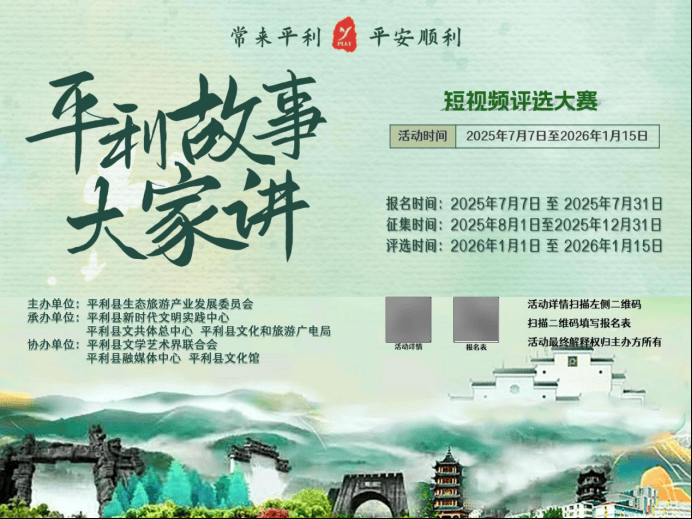 活动内容:征集以“讲好平利故事”为主题的短视频。干部、群众热爱平利文化,具备一定语言表达能力的均可参加,可个人或组队参赛。围绕历史人文或特色文化以及景区景点景观、民间故事传说、地方风土人情、传统民间技艺、平利好人、道德模范等方面。采取“实景实物+真人出镜”的方式。